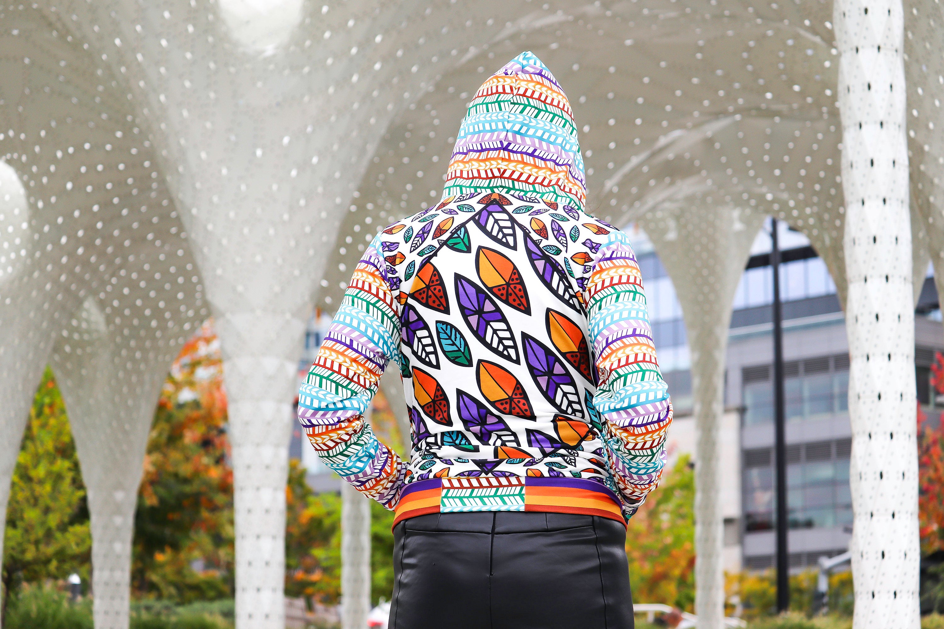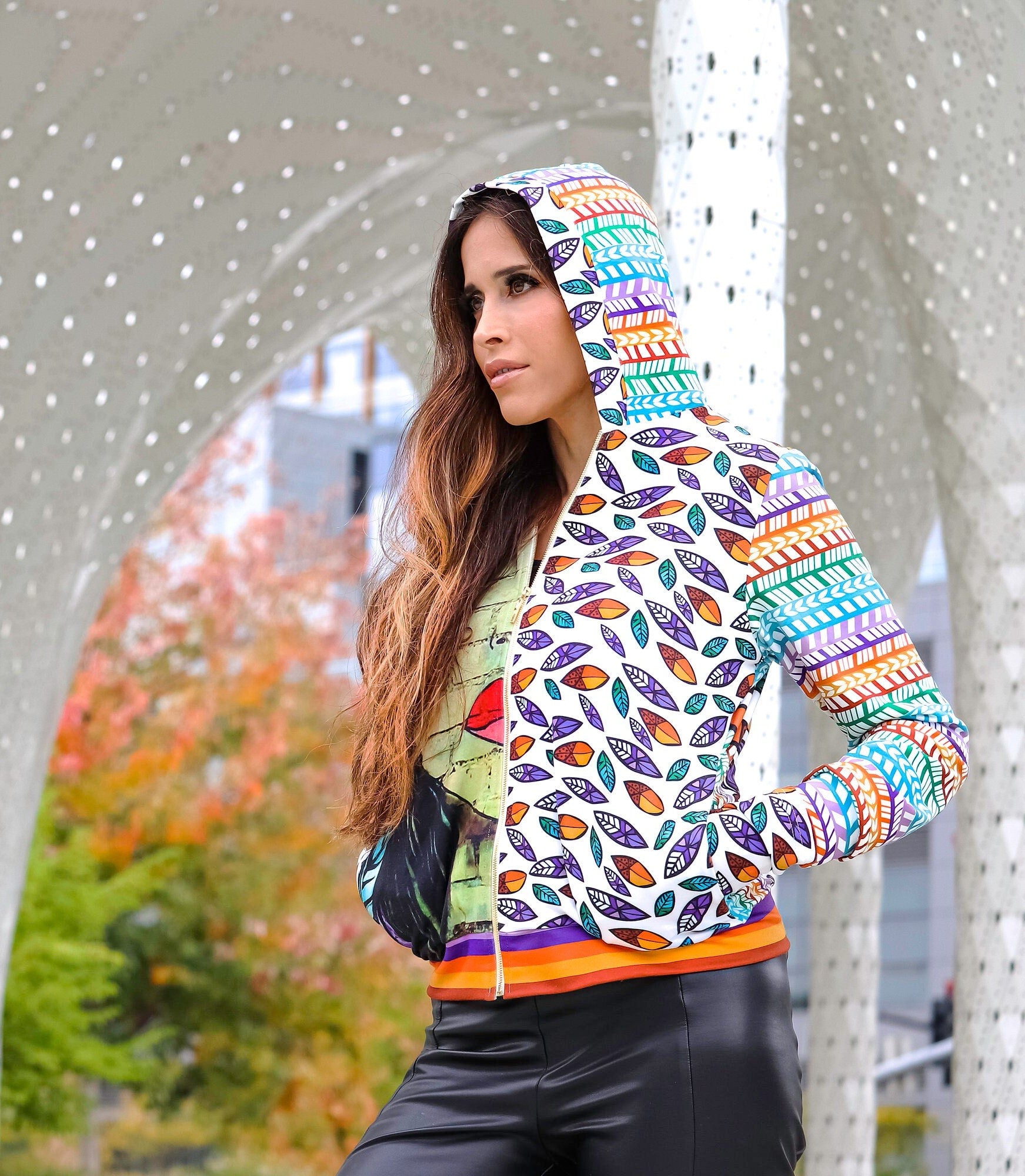 Introducing the "Summer Breeze" Hooded Jacket by Marina Atelier — where multicolored leaves and geometric designs meet a touch of summer on pristine white fabric. Elevate your style with this wearable masterpiece, featuring a painted woman's face on the side and convenient pockets. Embrace the carefree spirit of summer in Peruvian-crafted elegance